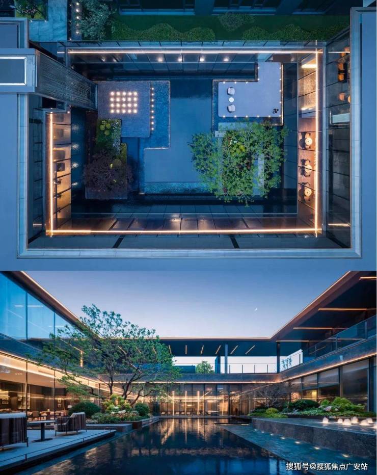 山水入画营造下沉式中央庭院 ,约12米飞流星瀑,臻选蓝翡翠奢石打造银河水境,百年丛生乌桕封藏四季风景,邀山水融自然,一方东方禅意画境