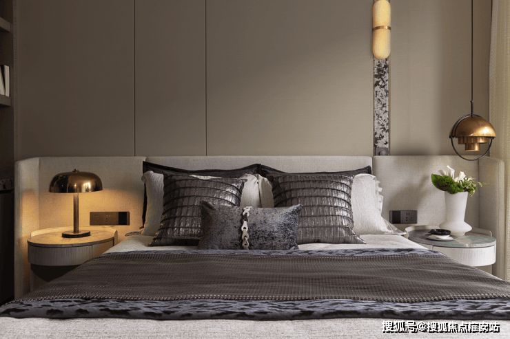 浅色系的床品与空间极致融合,木饰面搭配雪山兰奢石以深浅的明暗色调平衡臥房內的溫度,形成奢适与静雅的平衡,赋予空间深沉内敛的韵味,不失奢华。