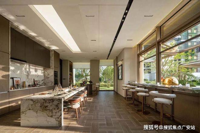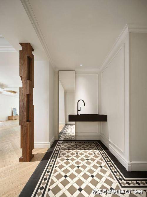 门庭。这里特指单元门庭,通高约4m,气势恢宏。大面积的金属屋檐外挑,彰显贵胄的同时,又扩大遮风挡雨的面积。进门左侧,色彩饱满的普拉达绿竖版镶嵌,美学传达与奢华品质相辅相成。进门后,又是大幅岩板上墙,气质拉满。