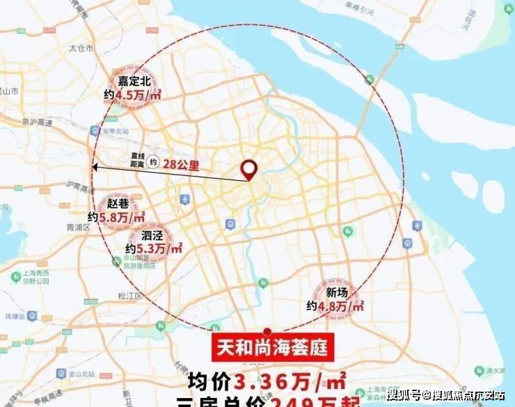 项目直线距离人民广场约28公里,我们以相同半径画圈,同一纬度的圆周板块,新房价格普遍超过5万/㎡
