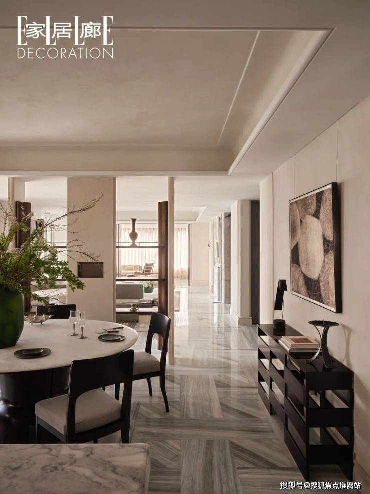 入户的一刻,空间的视觉体验从一个以小型圆桌为焦点的副厅开始。设计团队有意介入黄金十字轴的布局方法,对空间的界限进行模糊和延展处理,最大程度地释放尺度,强调仪式感的同时,制造和引导动线的洄游,让空间相互渗透,形成多义的生活形态。
