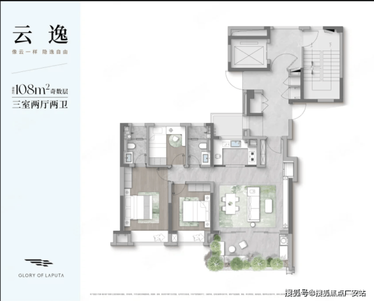 108㎡ 云逸 | 三室两厅两卫:奇数层/偶数层得房率均约95%,适合刚改家庭