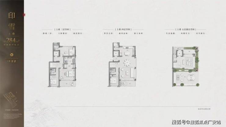 中间套300㎡地上三层双主卧套房设计,每间卧室连通露台或庭院;L型景观面实现“移步异景”。