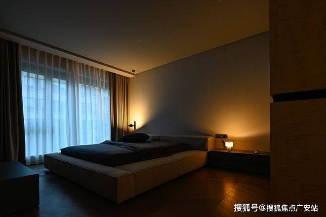 从客厅行至卧室,光线也由明转暗,携手人们渐入佳境。温暖柔和的光线呈点状晕散,柔顺迂回的线条在暗影中浮现,朦胧暧昧的氛围大面积散开,为夜色中的好时光作陪衬。