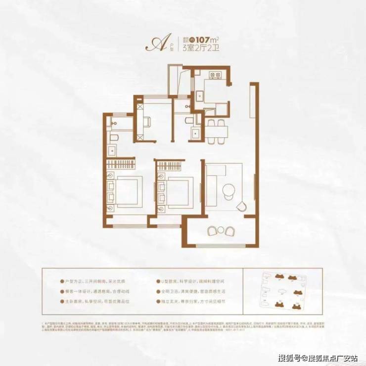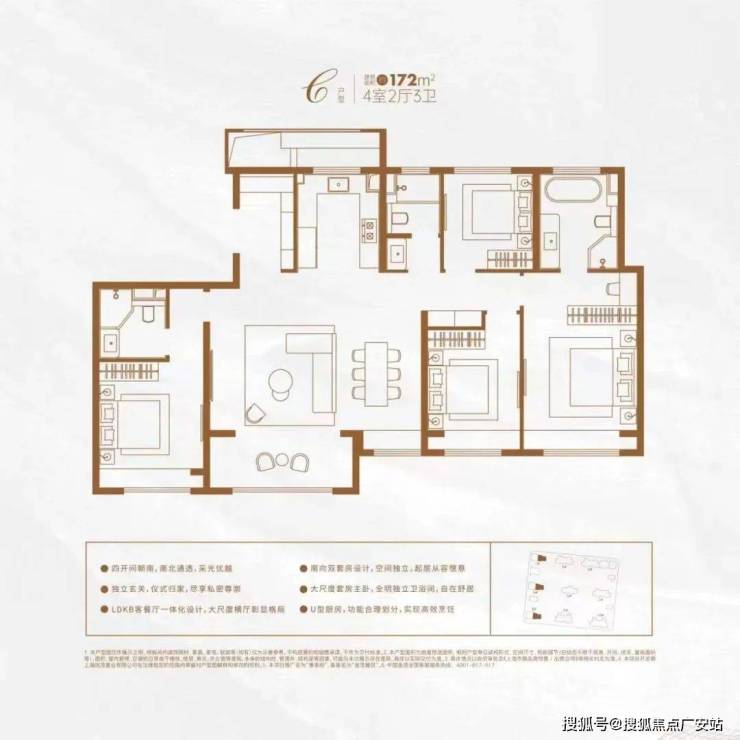该户型集LDBK一体化、玄关入户、动静分区设计、U型厨房、双卧飘窗、强大收纳等多重优势于一体,在功能性与舒适度上几乎都做到了极致!