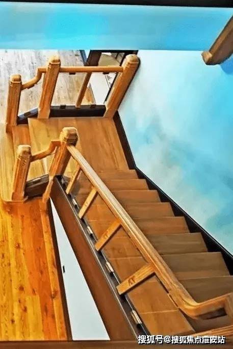 复式户型自带电梯,电梯古铜色线条搭配黑色厚重外框;室内同时还配有旋转楼梯,木材来自东南亚柚木。