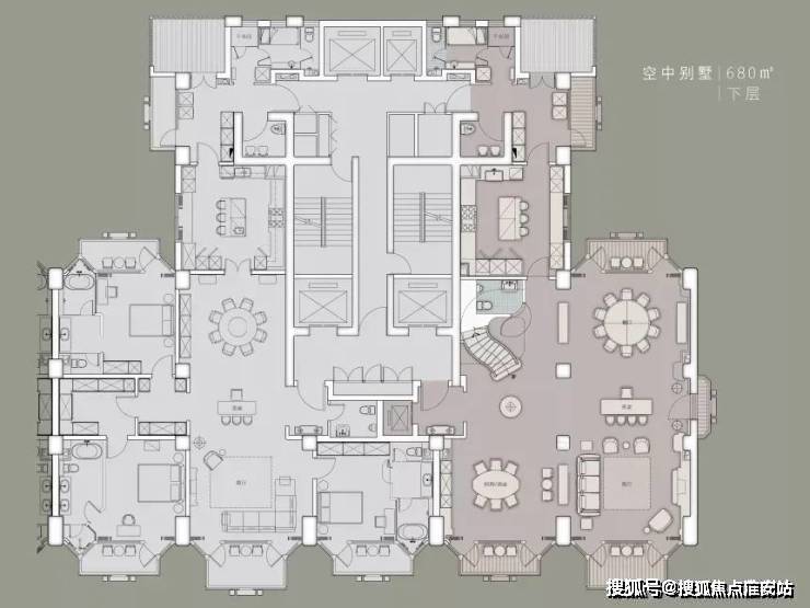 右面是680㎡复式套的一半(单层),同样户型随便创意,而且每户都配备了室内电梯,以及,这个户型上下共有10个阳台!