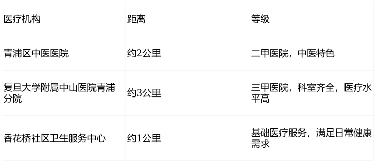 5.完善的医疗配套设施,开车10-15分钟左右就有朱家角人民医院、二级甲等医院中山医院青浦分院,还有部分社区医院等。