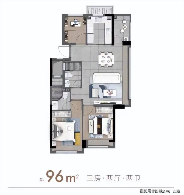 如果想要面积再大一点,也可以买建面约96平方米的3房2卫。