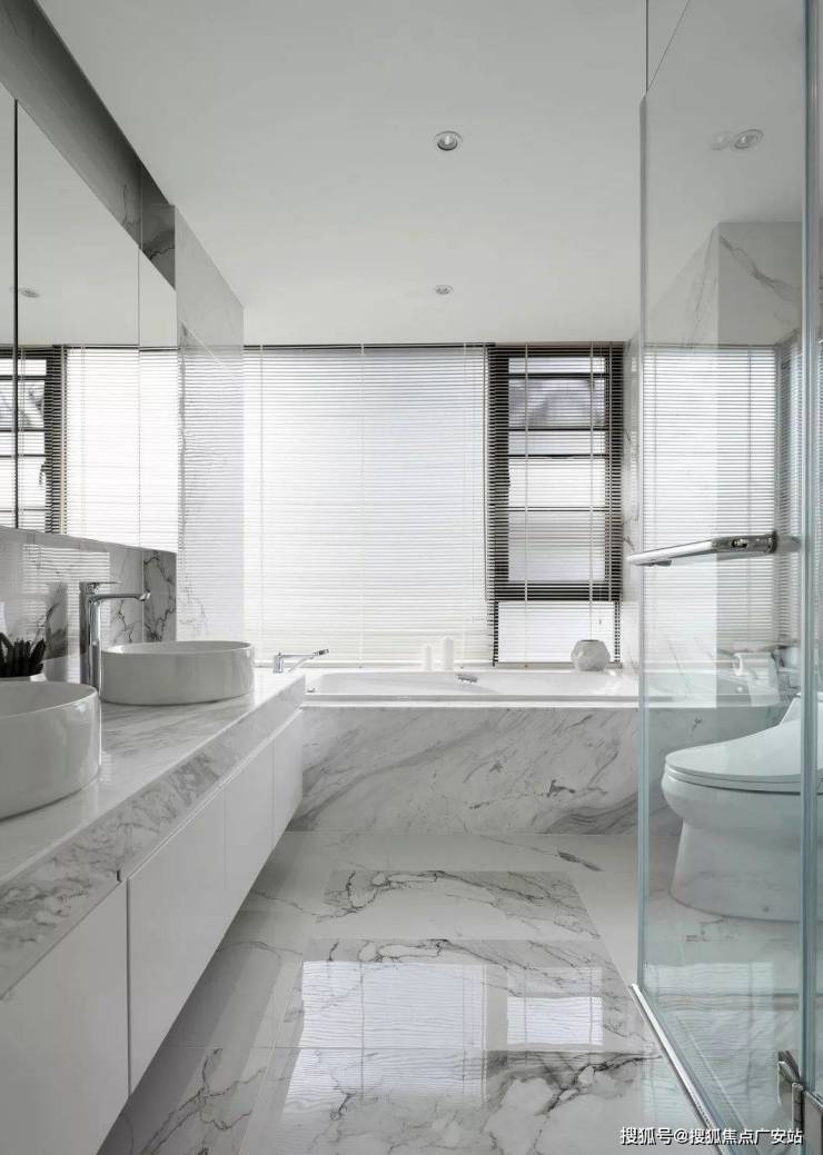 淋浴房做在内侧做了干湿分离的设计,保证了动线的流畅也不影响浴缸和马桶区域的视野。
