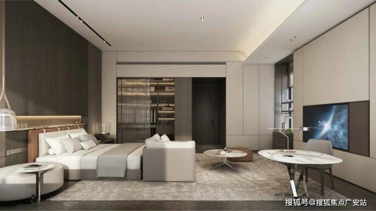 主卧的空间相对较大,背景是利用左侧的窗帘做的对称硬包的处理,其实后面有暗藏的灯带,使层次更为丰富一些,整体的家私和风格的感觉延续客厅,注重品质和空间的感受。