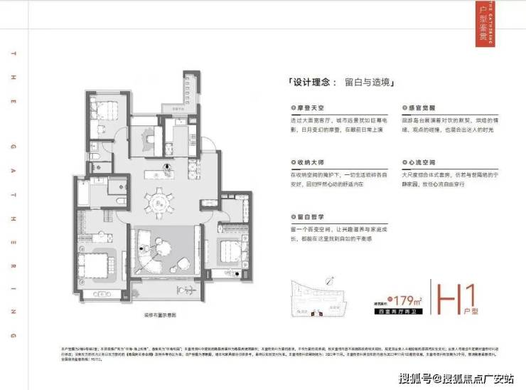 项目建面约179㎡4房户型打造了近50㎡的超大客餐厅、约5.4m宽的巨大窗景、约35㎡综合体式主卧尊享套房...营造了超越常规的尺度感。