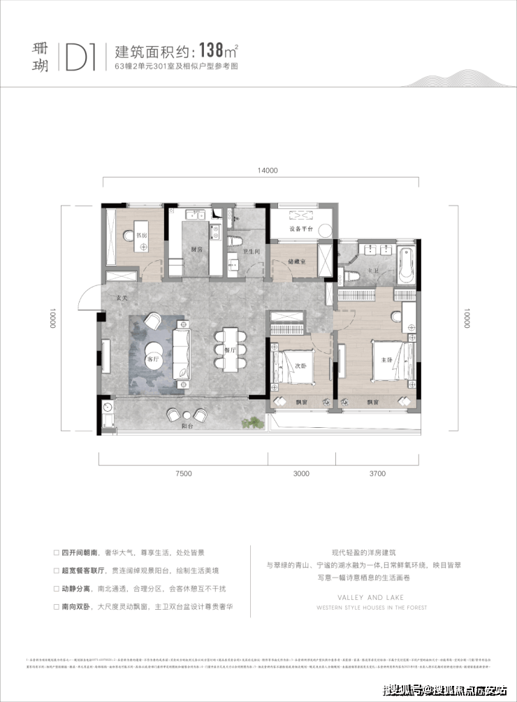 优势:双阳台设计,完美匹配湖山美景。客餐厨动线合理,观景飘窗连通了室内室外两重空间。南北通透、分区合理,尤其是储藏室的设计,十分贴心。98㎡的大两居,恰到好处地放大了各个功能区,整体看过去十分舒畅。