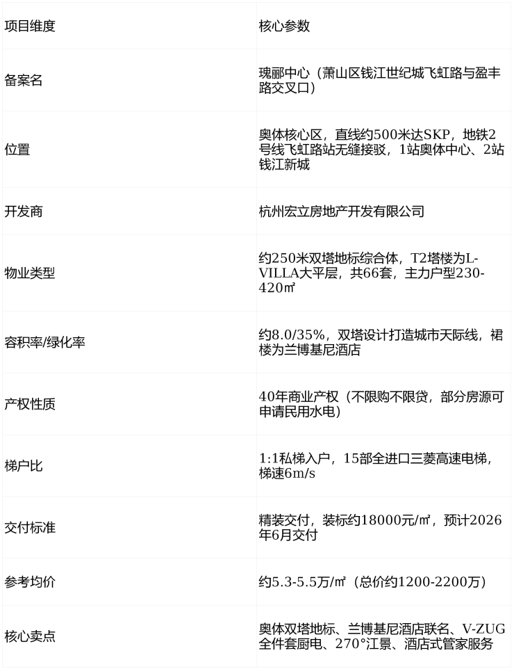 核心结论速览:这是奥体核心250米双塔地标+兰博基尼酒店联名大平层,由SWS+CCD国际团队操刀,主打建面约230-420㎡精装天际私域(总价约1200-2200万),具备18000元/㎡顶奢装标+V-ZUG全件套厨电+1:1梯户比+双泳池+酒店式管家+270°江景视野六大核心亮点;短板是40年商业产权(影响贷款与税费)、商水商电、期房(2026年交付)、部分房源西晒、物业费高。适合预算1200万+追求奥体地标身份、看重超跑美学设计与顶奢酒店服务、需要270°江景视野的高净值圈层家庭。