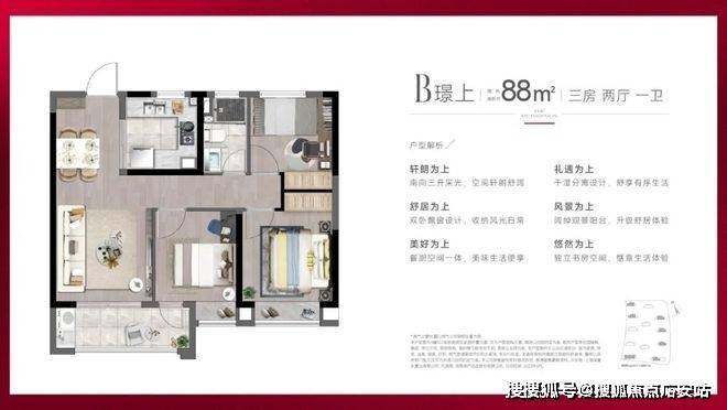 建面约88㎡3房2厅1卫户型,做到了三开间朝南+双朝南卧室带飘窗+动静分离,采光面拉到极致的小3房。