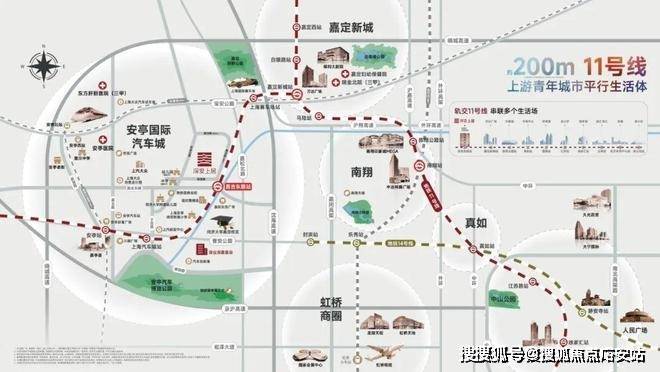 嘉定新城立足打通长三角一体化和虹桥国际开放枢纽的链接通道,构建“一核一枢纽、两轴四片区”的规划新格局。“一枢纽”即安亭枢纽——以安亭北站、安亭西站为核心,无缝连接虹桥国际开放枢纽,打造站城一体化、辐射长三角的综合交通枢纽。(信息来源:《嘉定新城总体城市设计》)除此之外,上海2035规划中的宝嘉线、嘉青松线即将启动,嘉安高速延展嘉定向东,与宝山互通,以安亭为枢纽核心,嘉定再次站在了时代发展的风口之上。