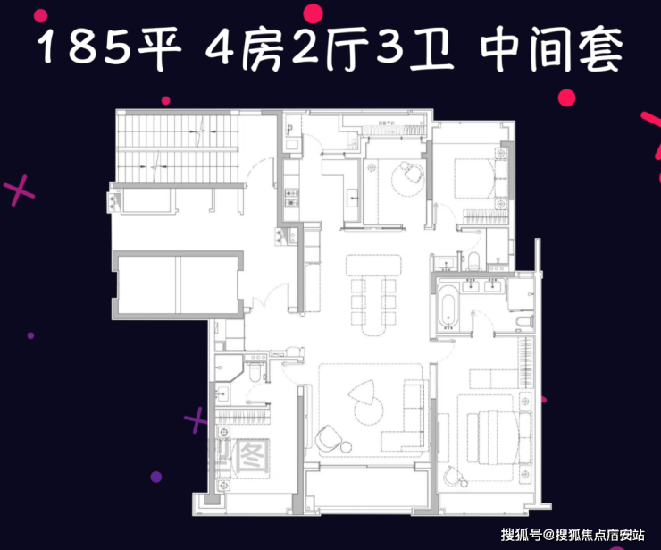 中间套185平4房3卫,总价2188—2804万, 采用四叶草布局,空间没有太多过道浪费,两个南向套房设计也比较实用。
