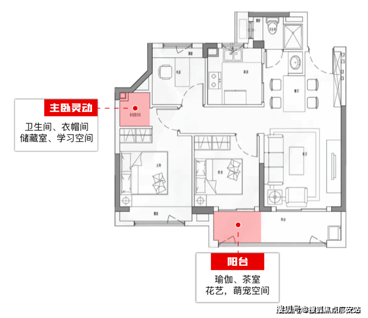 同时双开间的阳台面宽达到约5.5米,赋予家庭更多生活情景,可以开辟一个角落安排茶室、瑜伽、萌宠空间。