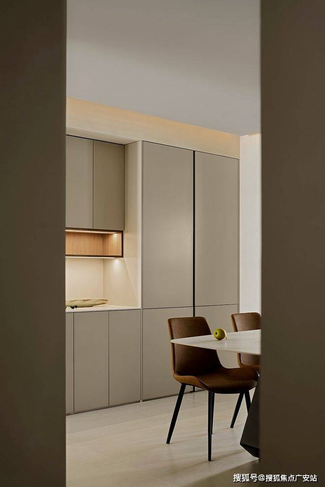 白色岩板餐桌,搭配驼色极简餐椅,形成冷暖碰撞的视觉焦点。整墙餐边柜浅灰色门板,简约又不失高雅,低调地融入空间。对面白墙增加了灯线点缀,使空间不至于空荡荡。