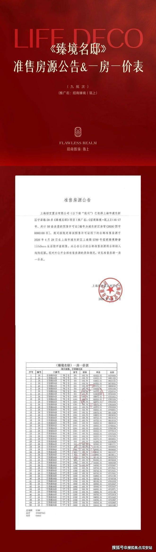 最新消息:一房一价表发布!浦东三林品质标杆「招商臻境·瓴上」二批次明天认购!建面约104㎡房源,共计50套!