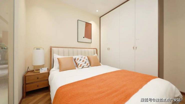 次卧空间简洁大方,注重留白,静谧、清幽。浅米色墙面搭配白色衣柜,色调素雅、纯净。橙色床尾巾与抱枕为空间注入活力,似宋瓷上的窑变色彩,自然而美妙。
