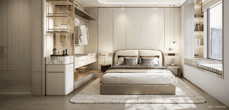 主卧里衣柜、梳妆台、休闲角、独立卫浴统统安排得妥妥的,生活感和品质感都拉满了。