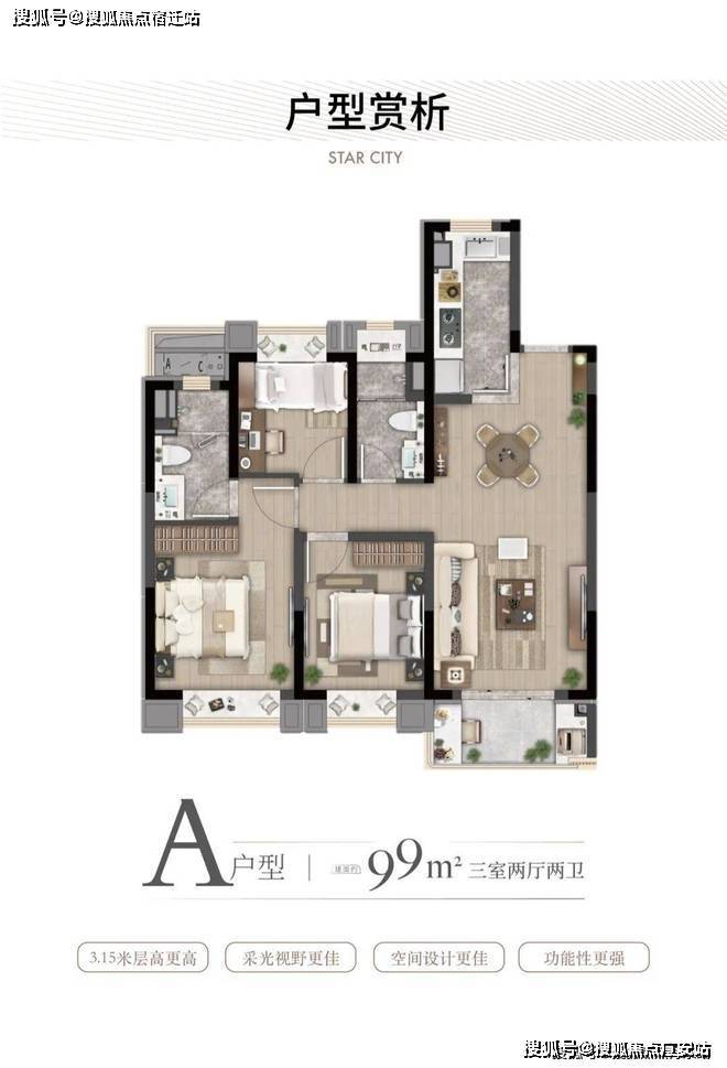 约89㎡户型:大虹桥范围不到90㎡的户型大部分都只做到2房,灿耀星城该面积段实现3房功能性,让自住客户一步到位,也让该产品进入二手市场后具备降维打击的优势!