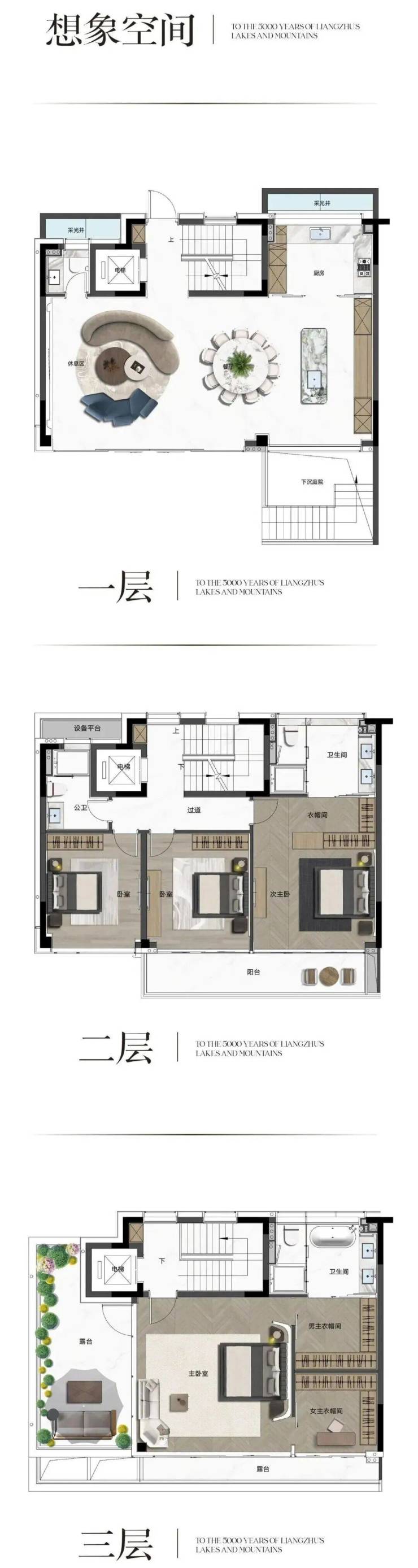 台地高差赋予了建筑更强的层次感,地面花园变成了“露台式花园”,而露台则变成了“空中的私人会所”,连卧室大落地窗都变成了“悬浮于林梢的取景框”,将良渚的自然肌理与人文景致尽收眼底,私密性与视野感双双拉满。