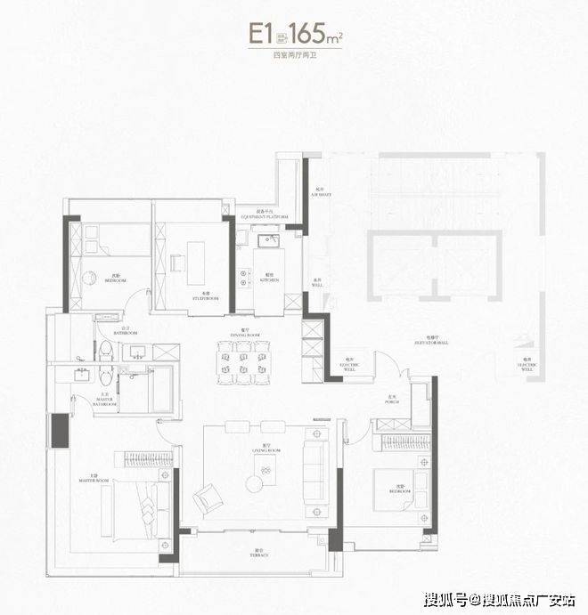 188户型2梯2户,有独立的电梯厅。4房3卫设计,还是3明卫,这两点还是不错的。