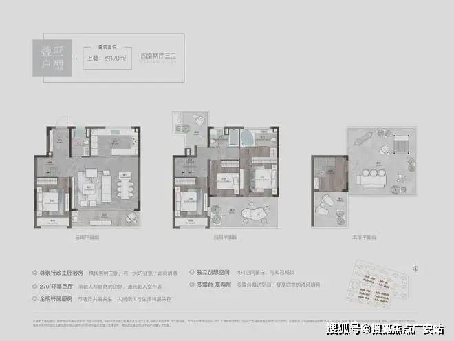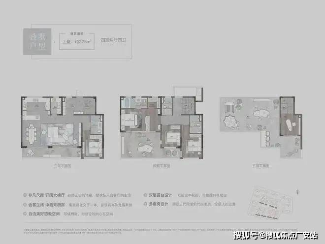 溪前雅居最小的叠墅户型,户型设计为4房2厅3卫,3层、4层均是三开间朝南,南向开间巨大,尺度阔绰。