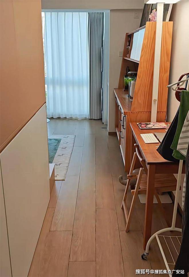 从厨房走出,转个身,便可以通向内室的客厅和卧室,但即便是这窄窄的走廊空间也没有被浪费,而是摆上一张书桌当办公区,另一边放开放式衣架和小柜子作为家里的入户玄关,每一寸空间都得到了合理利用。