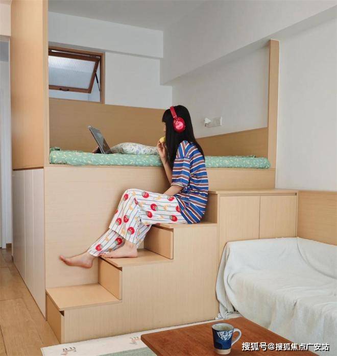 主卧室是一张壁橱床,和普通榻榻米床最大的区别在于,地台足足太高了1米,占据了一小半层高,像是上下铺,又像是LOFT。