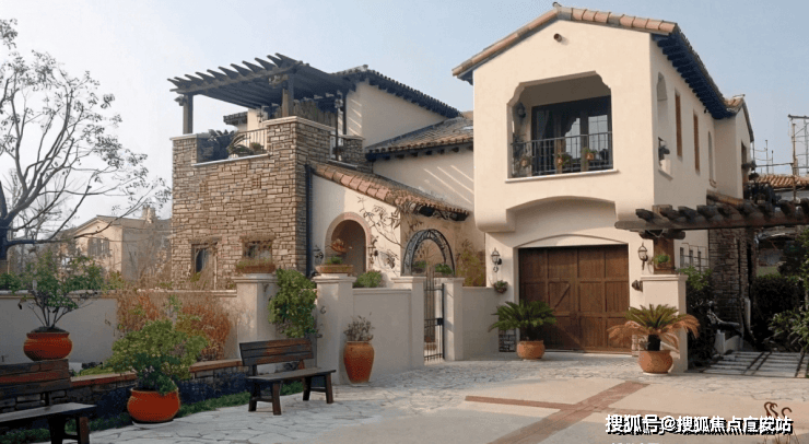 采用美国南加州的建筑风格,外立面采用淡黄色的手工 Stucco 抹灰外墙和红瓦屋顶,融入原木、三色瓦片、红砖、铁艺、各式烟囱等元素,仿佛置身异国小镇。在布局上采用中国传统的天圆地方的概念,每 4 户别墅之间会形成一个超大的庭院,营造开放式的活动空间。