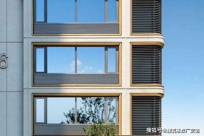 滨纷城便把建筑侧边做了圆弧角设计,南向外立面采用白色铝板、局部金属格栅等组合,金属线条用了经典9号库金色,远远望去,白金色搭配大气醒目。