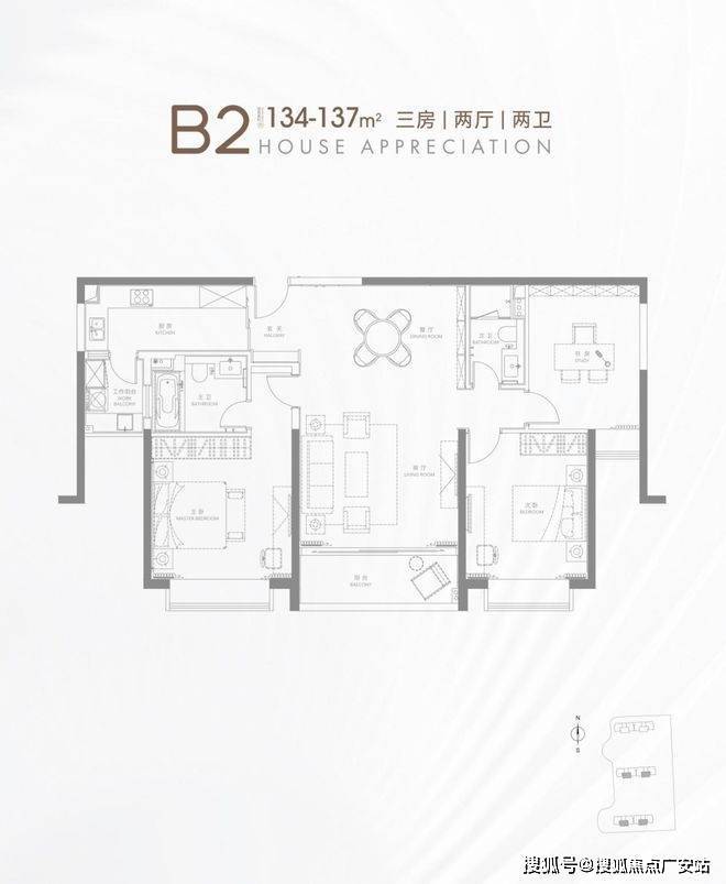 B2户型 建面约134-137㎡ 3房2厅2卫