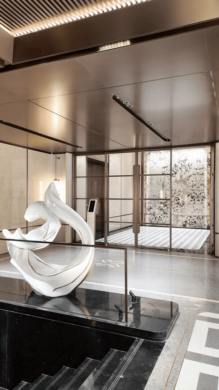 小区大门为歇山顶大门,形制媲美故宫乾清门,宽约53米(含景墙)、高近11米,鸱尾微翘,门两侧各置一块价值百万的蓝翡翠奢石,匹配高约2米(含基座)、重约600斤铜狮镇宅,搭配罗汉松迎客造型树,高定气场扑面而来,再设七级台阶,寓意步步高升,仪式感十足,中式的尊贵感从归家开始就把情绪拉满。