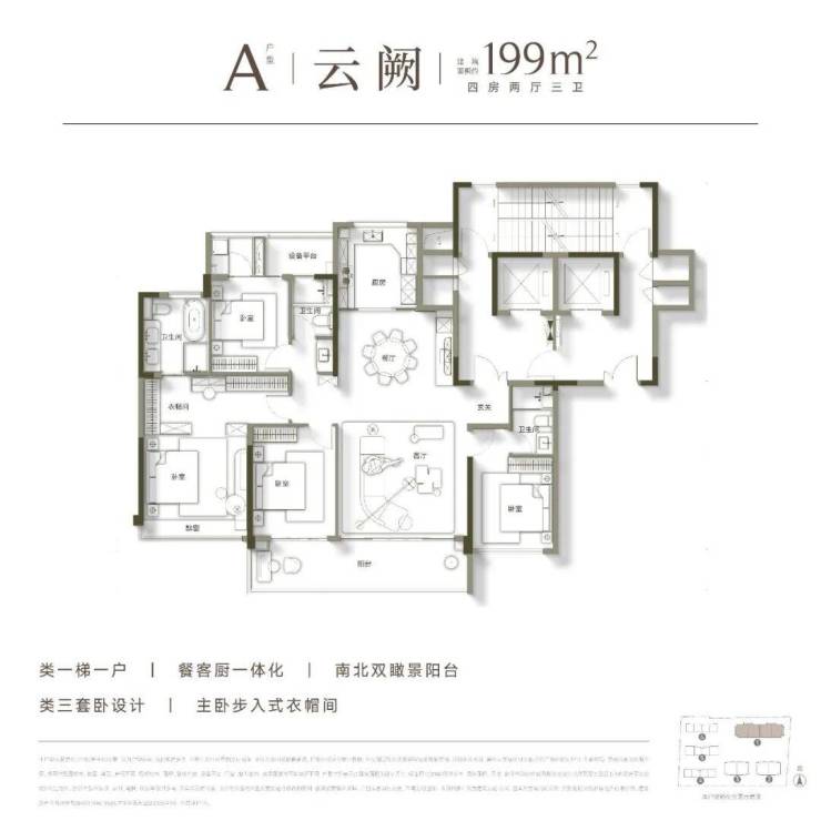高层均为建面约199㎡的大平层户型,极致纯粹的业主圈层,带来更为尊贵的居住体验。其户型设计尽可能扩宽南向开间的同时,展现出了极为阔绰的空间尺度,足以满足多代同堂的居住需求,成为众多购房家庭终极改善的首选。