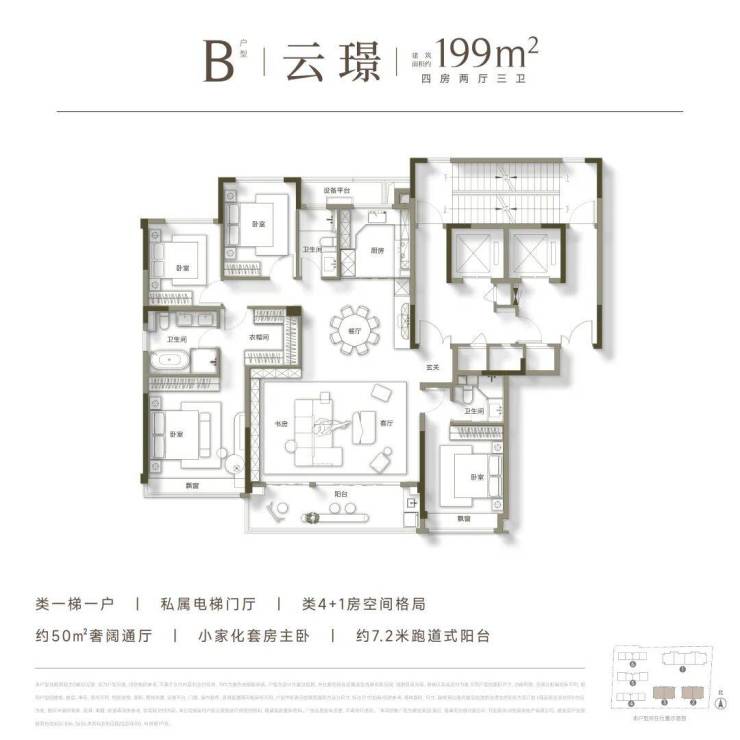 建筑面积约199㎡的A户型,采用类一梯一户的尊崇设计,实现“电梯厅玄关化”,保障极致私密性。户型南向面宽达约16米,拥有舒适开阔的南向客厅。南北双阳台设计,南向约8.5米景观阳台尽览美景,北向生活阳台轻松容纳洗烘设备。此外,独特的抬板设计使二楼离地约9.2米,相当于传统四楼的高度,带来更优的采光与视野体验。