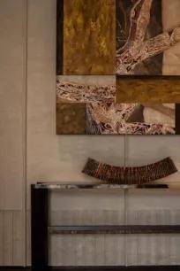 整个公区引入沉香米黄、透光云石、安哥拉黑、福鼎黑、橙皮红、宝格丽紫等近二十种全球奢石,宛如一座流动的奢石博物馆。