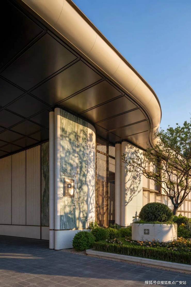 社区主入口是超宽幅门头,宽约80m高约7.1m,两侧的维多利亚绿奢石以及中央的白雪公主透光石很吸睛,浅色的部分则是贝金米黄石材,圆弧的工艺处理也更显温润及价值感,中央栽植的超大紫薇树拥有约60年树龄,底部则是采用宝格丽黑奢石作为基座。