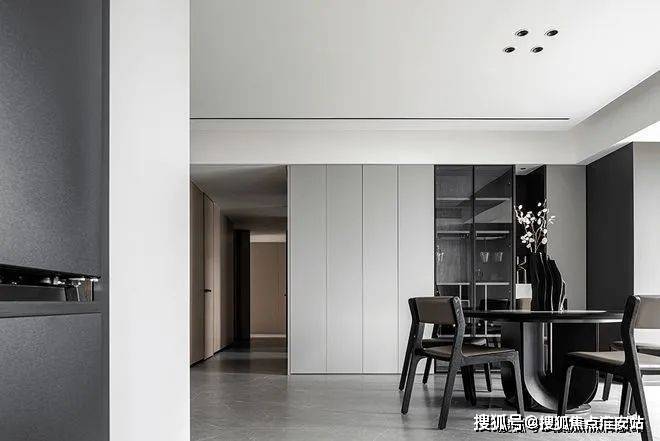 餐厨空间也采用同样的设计手法,增加内嵌式储物空间,让开放式厨房进一步宽敞,许多物品也有了摆放的空间。落地窗提高用餐愉悦感。
