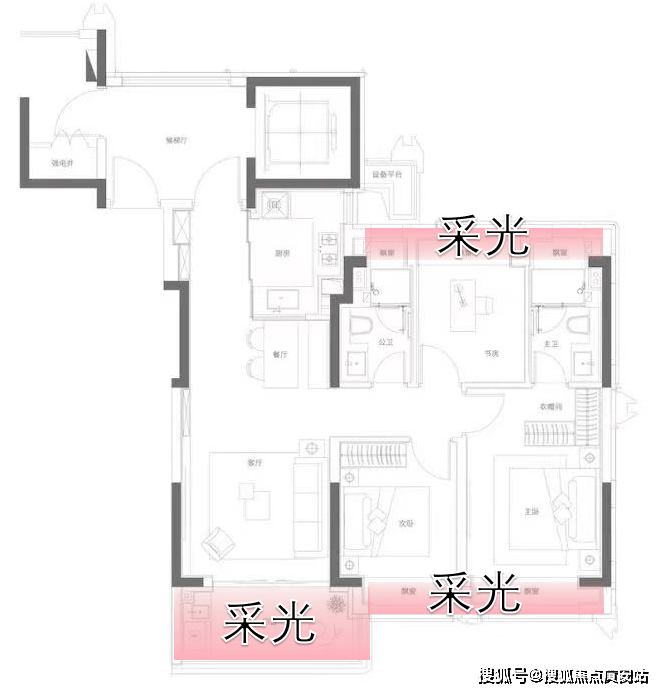 除了客厅连接南向阳台、南向卧室带飘窗外,北侧的书房和双卫也配置了飘窗,大大增加了实用性和空间感。