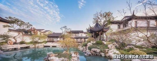 与全国在售中式作品相比,上海桃花源中轴五进制中轴园林,完整性、丰富度堪称全国之最.金瑞园坐北面南,由正南入园,中轴园林不仅设对景峰石、蜿蜒水街、太湖山石、亭台轩廊等景观节点,还以宽广山石庭园和辽阔水景,呈献潆回环抱之势,意趣无穷.另外,山林连绵、亭廊曲折,江南的温婉、隽永,尽藏其中.