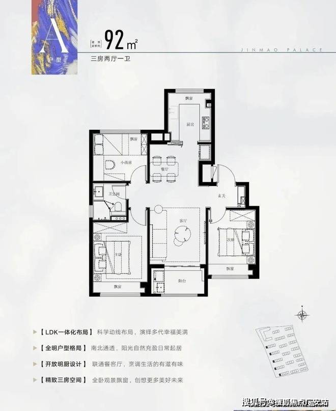 产品户型:92平三房两厅一卫、100平三房两厅两卫、135平四房两厅两卫、叠加