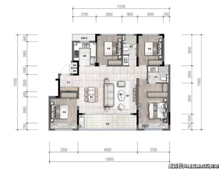 更出彩的是约139㎡四房两卫,南向面宽做到了约13.9米,带约6.9米大横厅+宽阳台,仅餐客厅面积就达约40㎡!