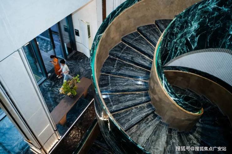 术旋转楼梯,进口Prada绿奢石勾勒出绸带般的轻盈曲面,每一个角度,每一次驻足,都宛如身处优雅画卷;
