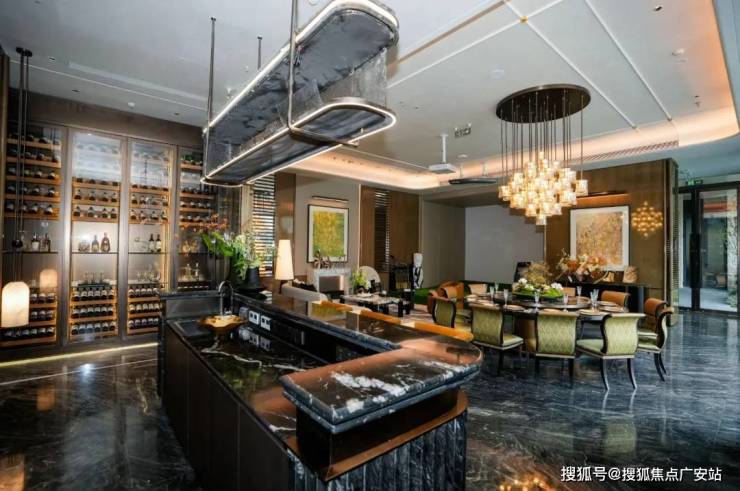大台面U型厨房,甚至还有豪宅标配的岛台设计,既可以作为调酒水吧,又能制作西餐轻食,与家人朋友亲密互动共享欢乐,既实用又有格调。