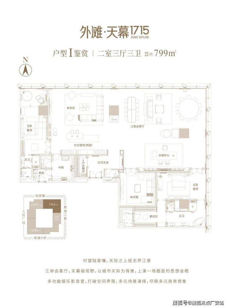 外滩·天幕1715,位于外滩地标绿地外滩中心T1#300m超高层楼栋,标准层高约4.5m,主力户型面积约724-799㎡,以一种塔尖群体向往的融合式生活方式,诠释外滩滨江恒产的价值高度。于此,以王者视角,俯揽黄浦江,对望陆家嘴,尽享上海城市之曜。