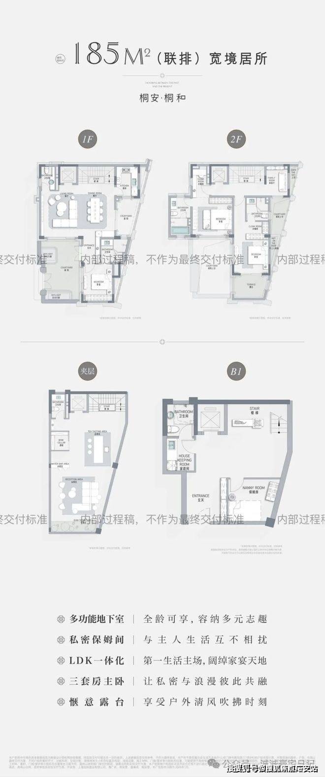 建面约185㎡联排,赠送地下室约132-136㎡,赠送花园、露台、阁楼,总价约3300W起;