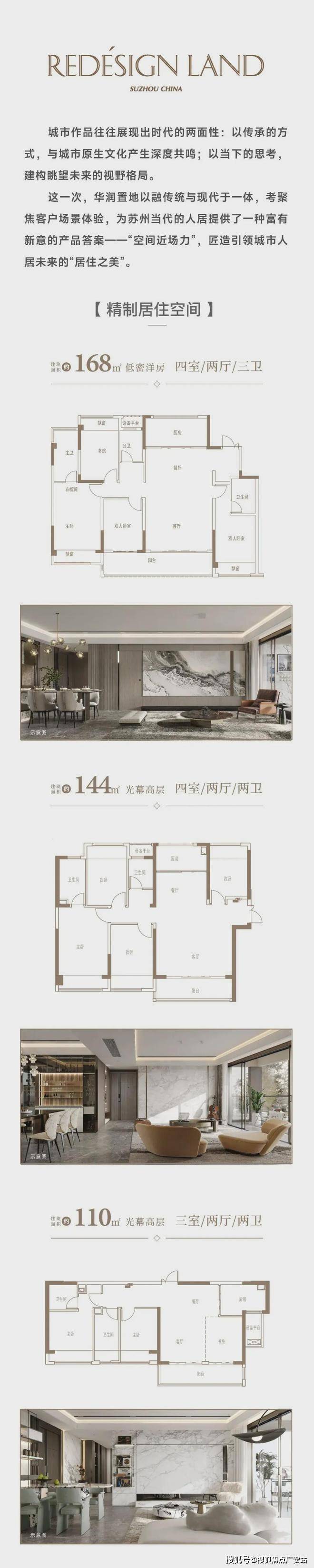 择址平江新城,姑苏新中心,润宸借鉴国际社区设计理念,规划12栋住宅,其中8栋约168㎡低密洋房、4栋约110㎡/144㎡光幕高层,凭借润系高阶作品对国际新锐生活的理解,以镜面美学立面、苏韵园林景观、万象服务产品服务力、润心会所文化、匠心精装产品,打造与平江共赴新的国际轻奢改善住区